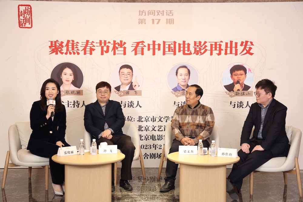 2月15日,北京市文联举办文艺评论系列学术活动“坊间对话”第17期《聚焦春节档 中国电影再出发》,央视电影频道主持人张晓丽与制作人兼影评人谭飞,中国艺术研究院副研究员孙佳山和梁文杰对谈,共话中国电影工业化道路上的进步与不足。