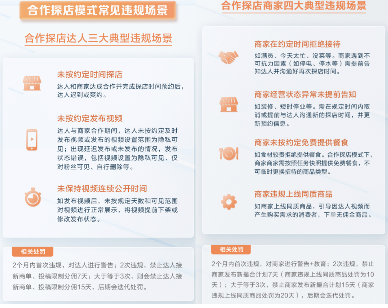 为保障探店规范实施,抖音生活服务同步上线了多个场景的治理与判责能力,覆盖包括商家经营状态异常未提前告知、商家在约定时间拒绝接待、未按约定免费提供餐食、违规上线同质商品,以及达人未按约定发布视频、未按约定时间探店、未保持视频连续公开时间等违规场景,预计可以解决目前大部分商达纠纷问题,接下来还将继续完善平台治理与判责能力,保障双方的权利。