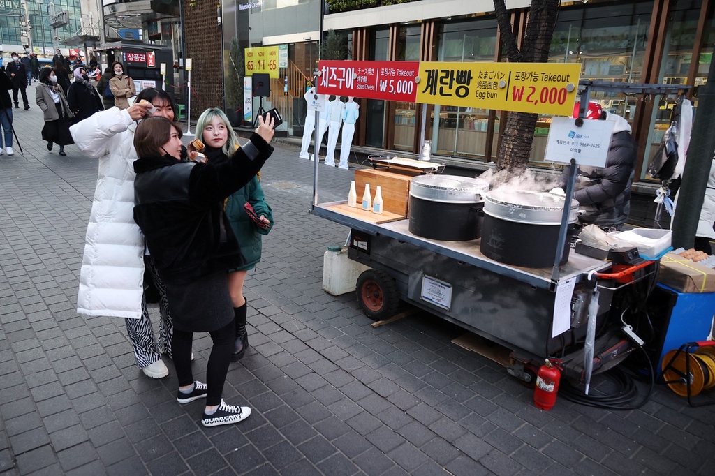 1月9日,游客在韩国首尔明洞自拍。(资料图)