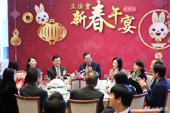 香港特区立法会今天(2月17日)举行新春午宴,特区行政长官李家超、行政会议成员、政府高级官员和立法会议员等,共约200人齐聚一堂贺新岁。