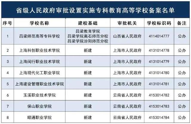 2月15日,教育部办公厅发布《关于公布实施2022年度专科教育高等学校备案名单的函》。根据《中华人民共和国高等教育法》《普通高等学校设置暂行条例》等有关法律法规和政策文件的规定,教育部将省级人民政府审批新设的专科层次高等学校备案名单予以公布,其中,云南省审批新设3所专科层次高等学校,分别是: