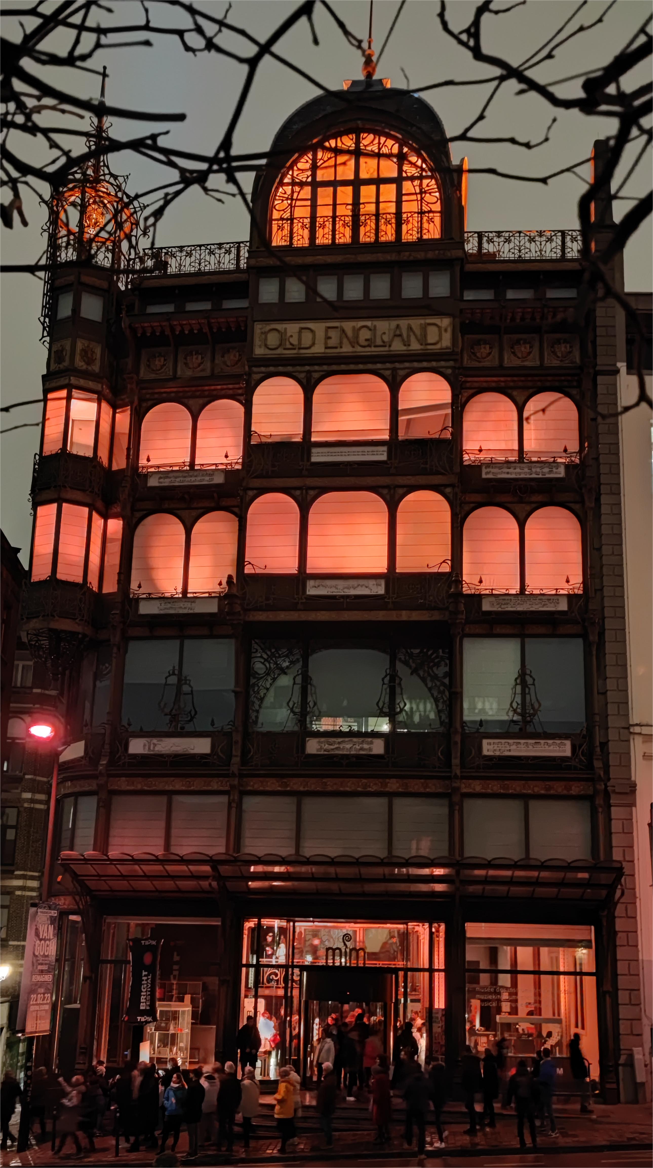最具代表性的新艺术风格建筑之一—布鲁塞尔乐器博物馆(原老英格兰百货商店)亮起彩色灯光。滕宇鹏摄