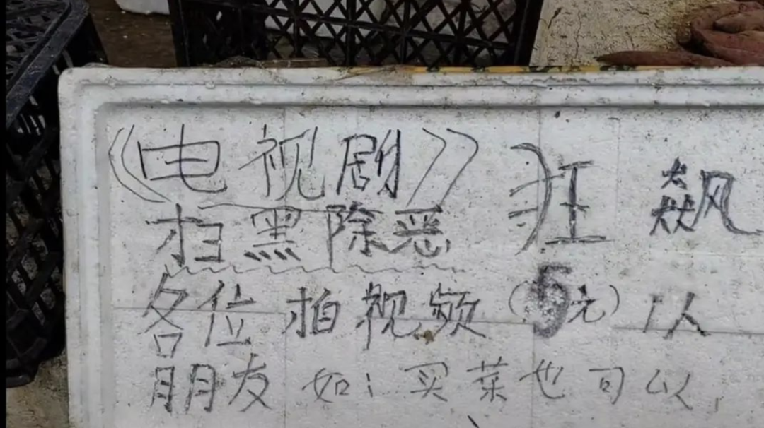 近日,有网友发布视频称,其在电视剧《狂飙》取景地广东江门台山市四九市场拍照时,被一女子索要5元拍照费用。视频中,旁边的菜摊前摆着的泡沫板上写着“各位拍视频5元1人,如买菜也可以”。