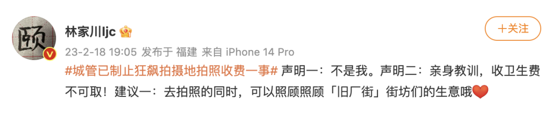 北京日报(ID:Beijing_Daily)注意到,2月18日19时许,《狂飙》中唐小龙的扮演者林家川就此事发微博:“声明一:不是我。声明二:亲身教训,收卫生费不可取!建议一:去拍照的同时,可以照顾照顾「旧厂街」街坊们的生意哦!”