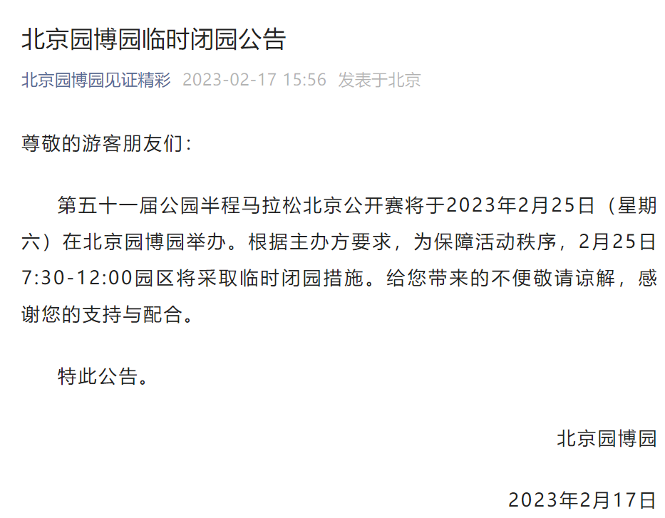 北京园博园运营有限公司近日发布《临时闭园公告》。《公告》表示,第五十一届公园半程马拉松北京公开赛将于2023年2月25日(星期六)在北京园博园举办。根据主办方要求,为保障活动秩序,2月25日7:30-12:00园区将采取临时闭园措施。