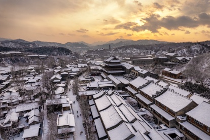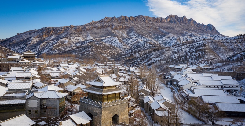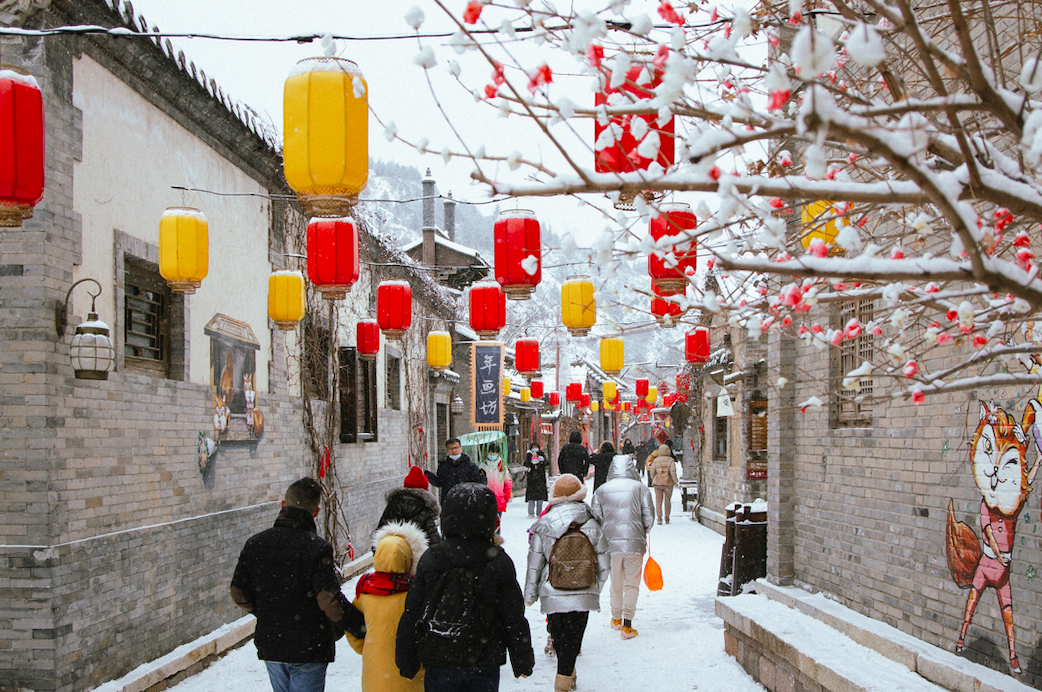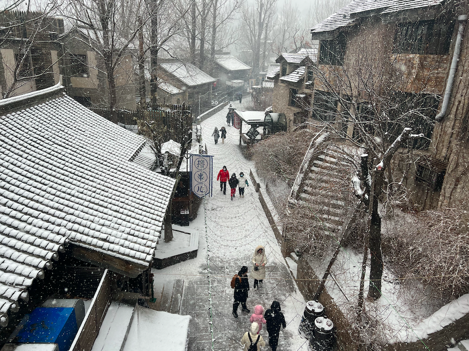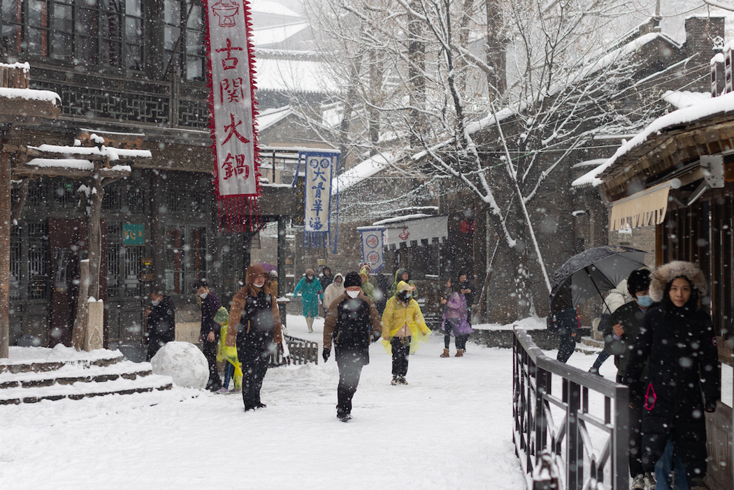 2月18日,天空飘起雪花,坐落在司马台长城脚下的古北水镇银装素裹,别有一番韵味。人们在雪中纷纷放慢脚步,有的静静观赏雪景,有的和同伴拍照留影,有的还堆起了雪人。