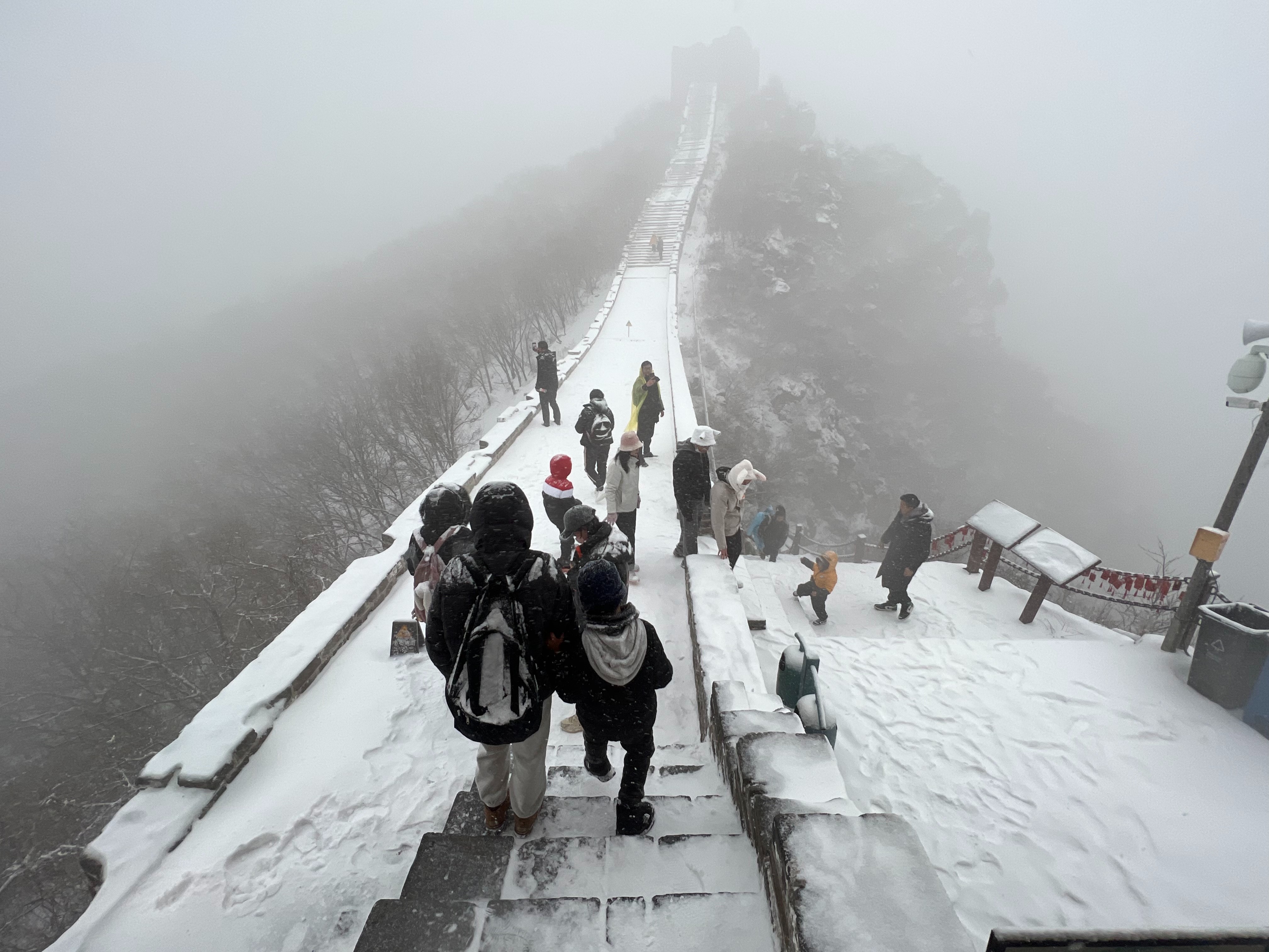 大雪纷飞中,不少游客选择乘坐缆车登长城。“我们先坐了一段缆车,又爬了一段石头台阶,终于见到了雪中的司马台长城。”和闺蜜一起游玩的小琳说,这是她们第一次见到雪中长城,宛若银色长龙的景色令人震撼。