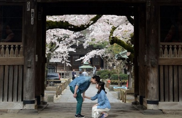 2017年4月8日,在日本东京,一对情侣在樱花树下亲昵。图源:新华社
