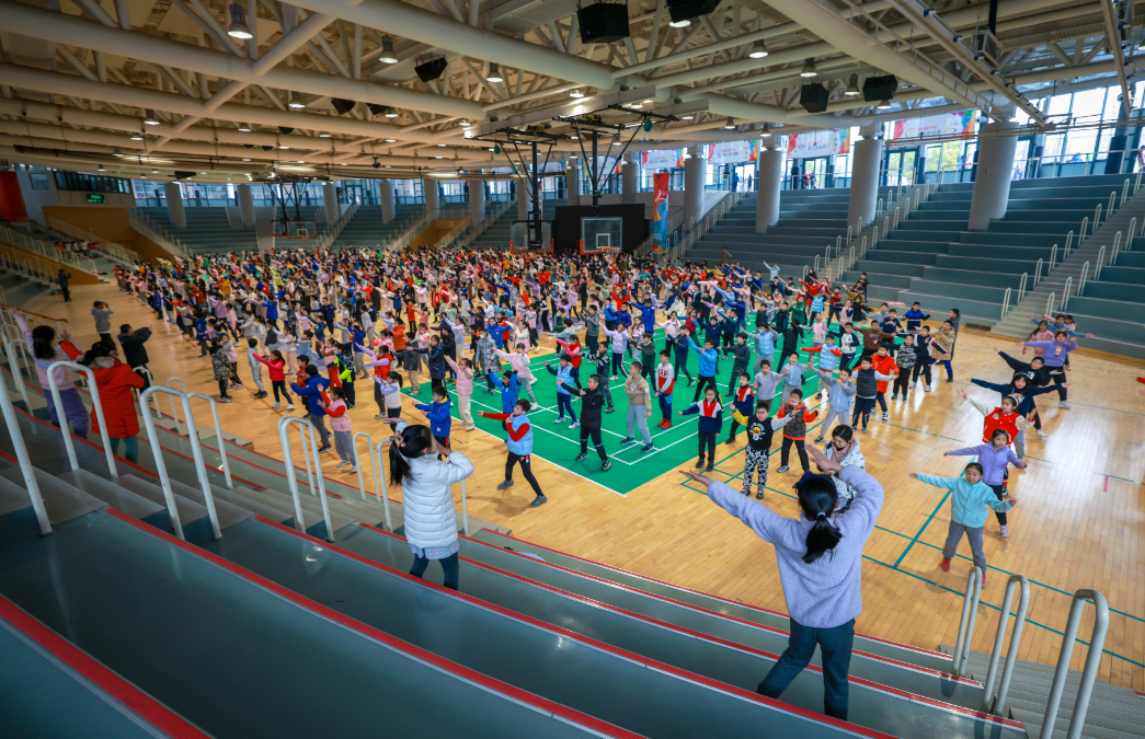 上午10时30分,中关村三小北校区的综合性体育馆里,各班学生正在跟着体育老师的指令进行队列练习,迅速完成原地转体、踏步等动作的同时,学生们高声喊出口号,个个精神饱满。随后,轻快的音乐响起,各班领操员站上领操台,所有学生踩着节拍动起来,跟着音乐抬抬腿、舒展手臂。