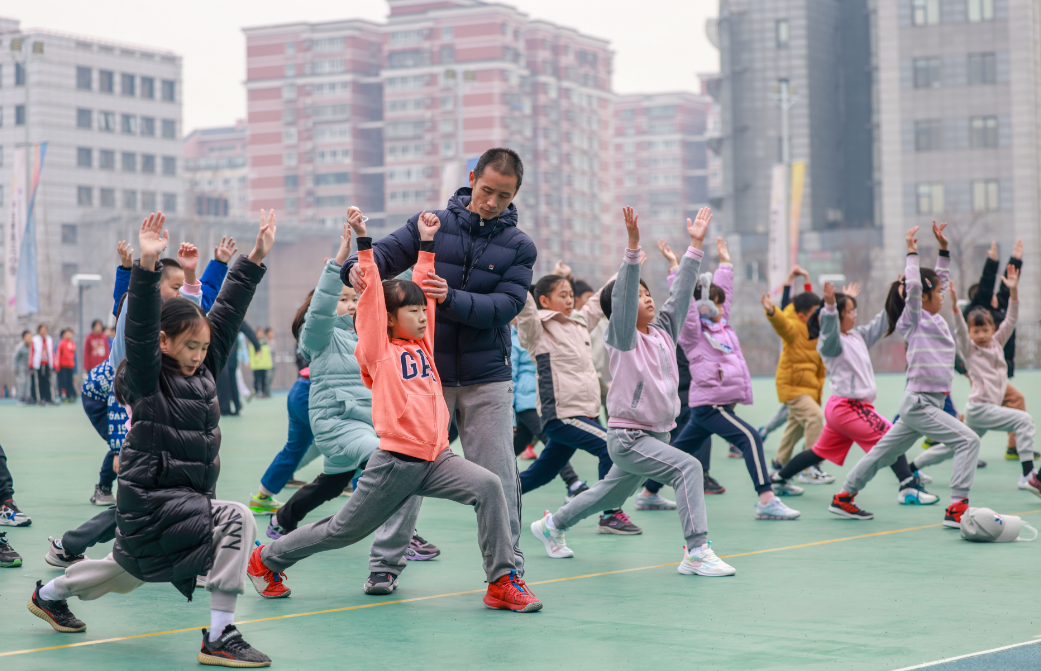 “喊口号其实是在练习心肺,韵律操、跳长绳等以柔和的全身性运动为主,让孩子们在低强度、低密度的锻炼中,逐渐恢复体能。”领操台旁,该校体育学科主任李兵正在观察学生们的运动状态。他介绍,该校制定了一份“28天元气恢复锻炼计划”,主要分为5个阶段:第一阶段以全身深度拉伸为主,缓解身体不适;第二阶段以全身舒展和有氧适应为主,通过游戏和活动设计,开展低强度、低密度的锻炼;第三阶段和第四阶段逐步增加运动强度和运动密度,加入慢速跑等心肺训练和低强度力量训练,激活全身肌肉群、恢复体力;第五阶段,学生恢复常态化体育锻炼,强化运动能力、提高免疫力。“老师们会根据不同年级、不同学生的实际情况,灵活调整课间活动和体育课的锻炼项目,让每名学生都能健康、安全、快乐地运动。”