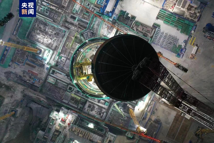 凌晨2时36分,随着风速测量符合标准,3200吨履带式吊车缓缓将总吊装重量518吨的外穹顶吊离地面,经过变幅、升钩、行走平移、调整等一系列高精度动作,历时3小时22分,穹顶精准地就位于堆顶结构之上。