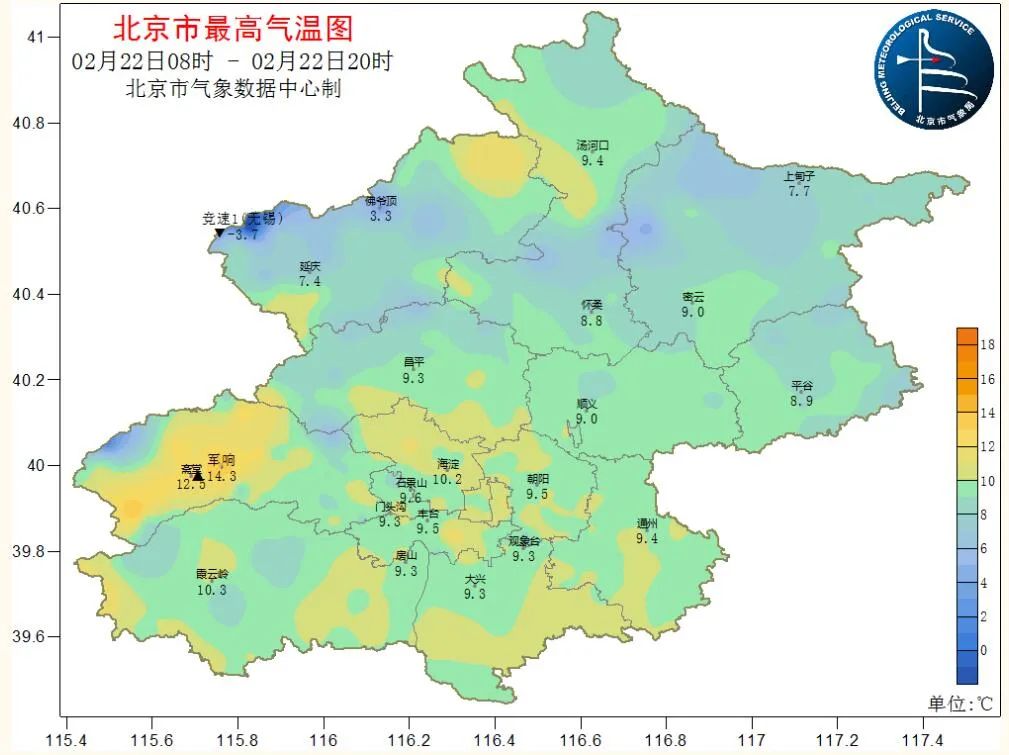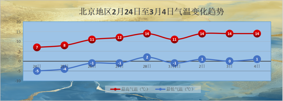 南郊观象台2月24日到3月4日最高气温7~14℃,最低气温-5~2℃。