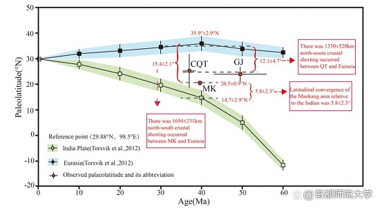 图1 6,000万年以来亚洲、印度以及芒康等地区的纬度变化示意图