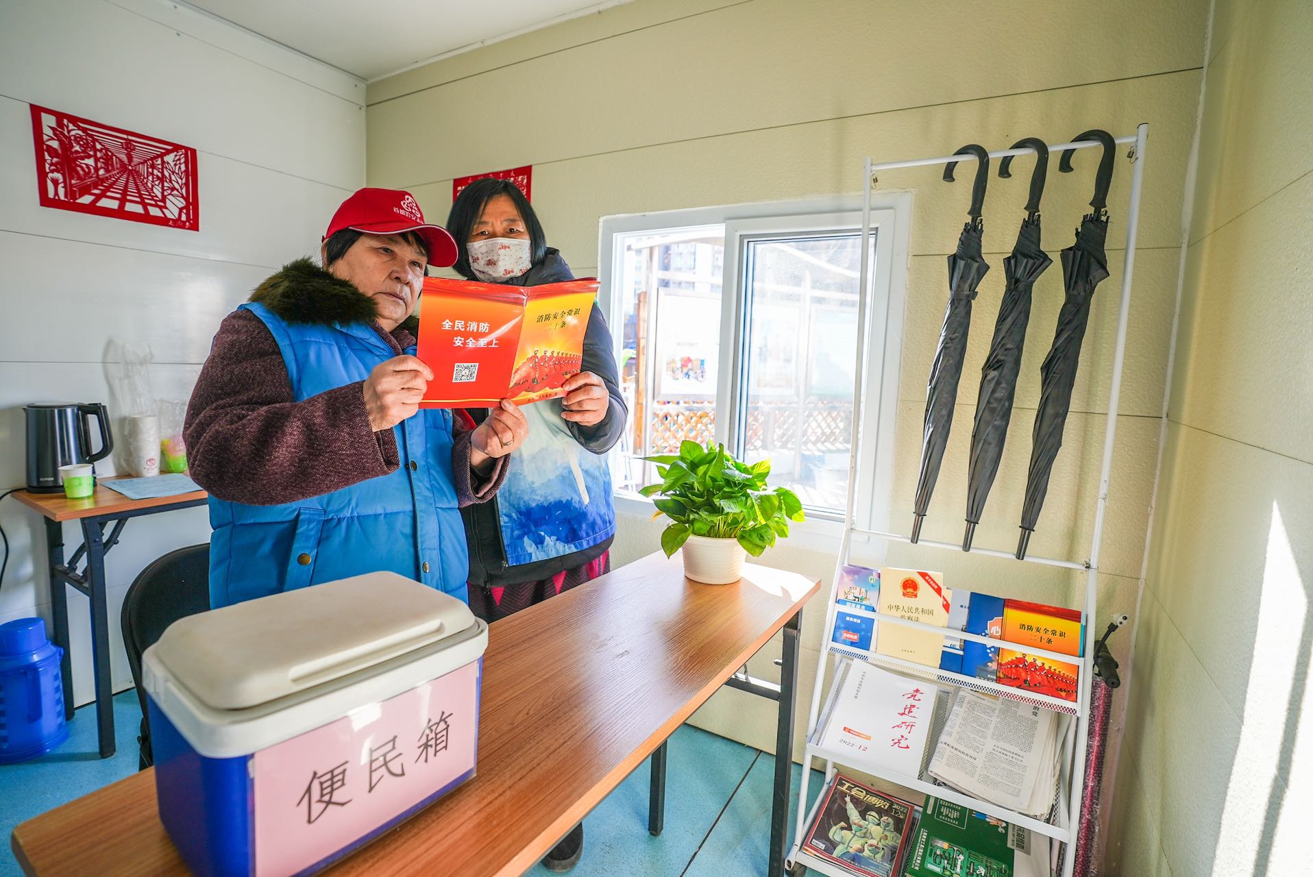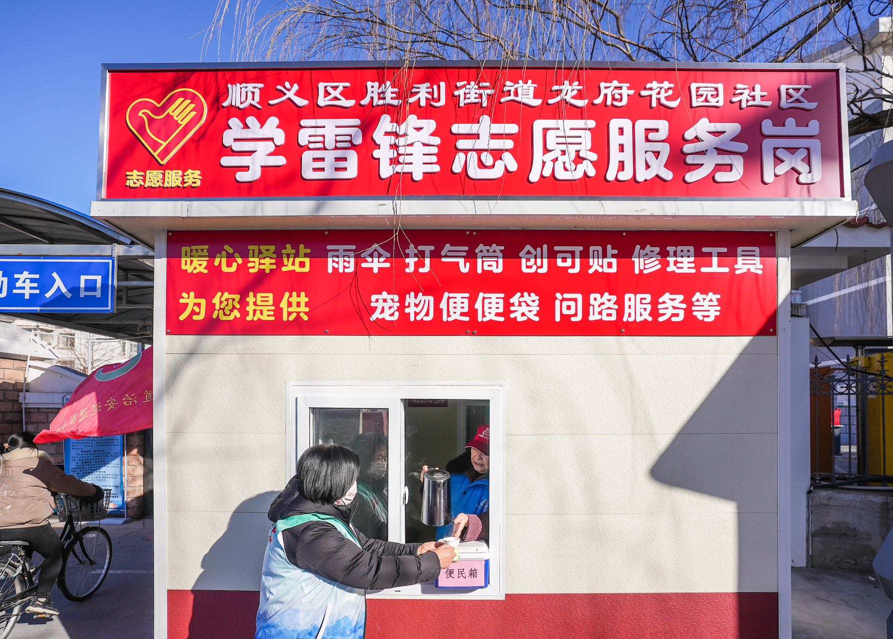 走进不到10平方米的小屋,第一感觉就是温暖。这份温暖不仅是空调吹出来的,更是屋内的小细节展现出来的。大门上贴着春联和福字,屋里准备了桌椅、热水壶、雨伞、充电器、打气筒、修理工具、创可贴、书报杂志等一应俱全。“车胎没气了,可以来免费打气;出门遛狗忘带宠物便便袋,这儿也有提供;路人来问路,我们也义务服务。”赵培珍说。志愿服务岗亭不仅为居民提供方便,还让快递小哥、外卖小哥、环卫工有了“歇脚处”,他们冷了、累了、渴了,可以随时进来歇一歇。