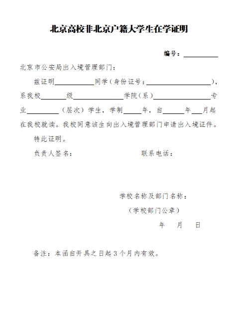 《北京市工作居住证确认单》随往人员暂无法在京办理签注业务,《北京高校非北京户籍大学生在读证明》模板可在“北京市公安局”官网-办事表格-出入境中下载。