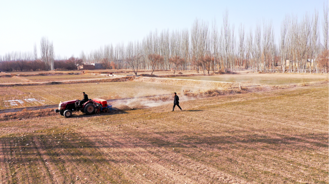 村民依沙江·伊斯拉木用大型施肥机给小麦追施返青肥。柯坪县融媒体中心