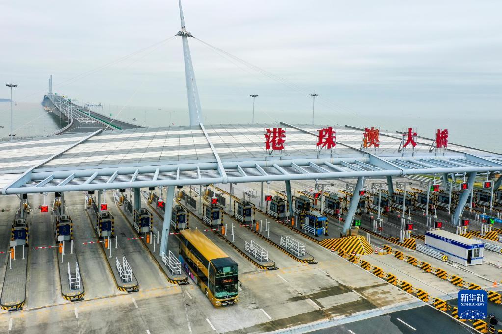 一辆从香港开往珠海的港珠澳大桥穿梭巴士入境珠海(2023年1月8日摄,无人机照片)。新华社记者 刘大伟 摄
