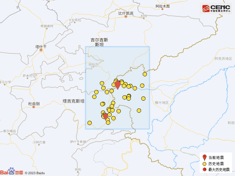 历史地震:根据中国地震台网速报目录,震中周边200公里内近5年来发生3级以上地震共158次,最大地震是2023年2月23日在塔吉克斯坦发生的7.2级地震(距离本次震中181公里),按震级大小前50次历史地震分布如图。