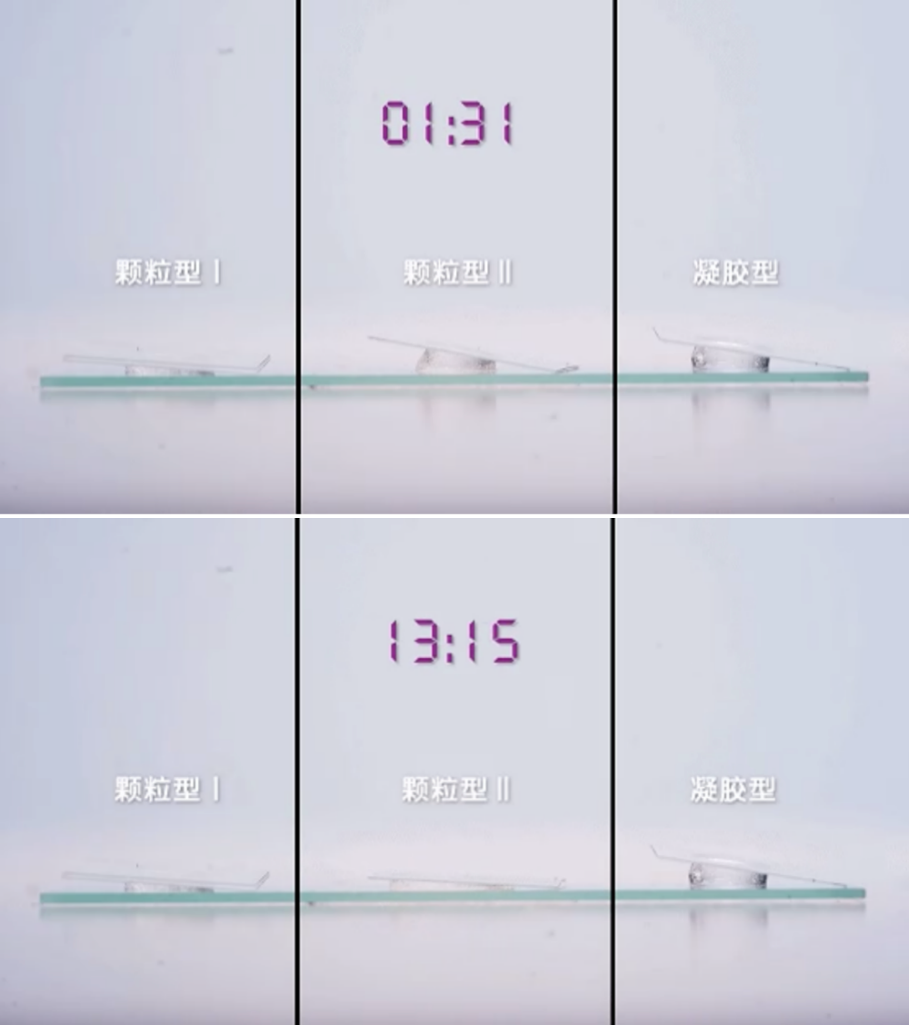 ▲不同质地的玻尿酸形变情况与承压时长示意图,其中双相玻尿酸(左+中),单相玻尿酸(右) 图源:知乎用户@滕滕