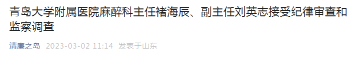 青岛大学附属医院麻醉科主任褚海辰、副主任刘英志涉嫌严重违纪违法,目前正接受青岛大学纪委纪律审查和青岛市市南区监委监察调查。