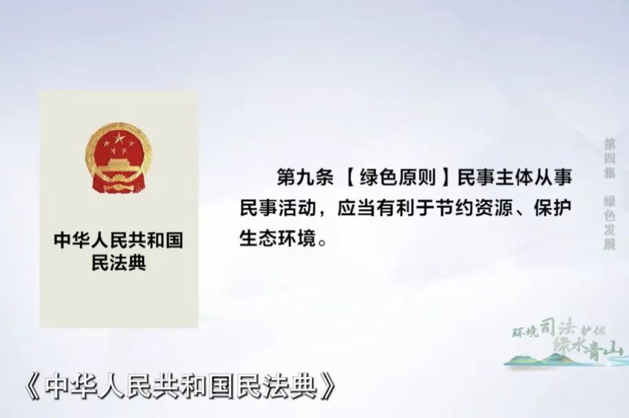 《中华人民共和国民法典》第九条规定,民事主体从事民事活动应当有利于节约资源,保护生态环境。这一条款也被成为“绿色原则”。