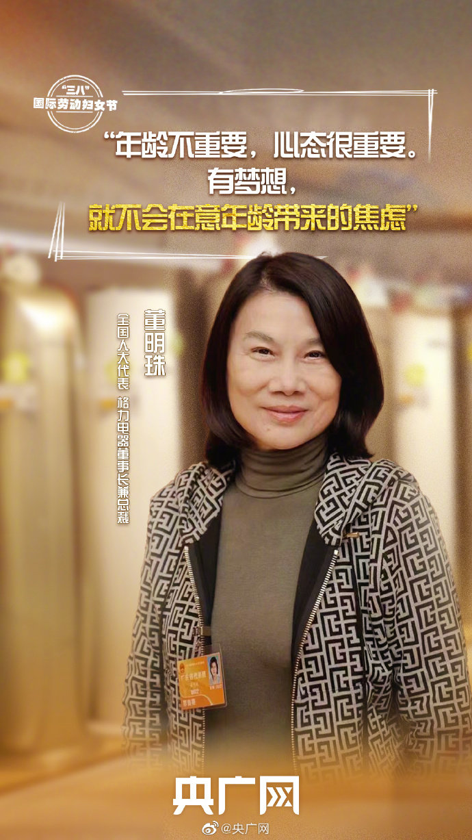 全国人大代表、格力电器董事长兼总裁董明珠表示,对于职场女性,年龄不重要,心态很重要。有梦想,就不会太在意年龄带来的焦虑。其实人美与不美,指的并不是你长得漂不漂亮,而是内在里透出来的精神,这才是真正的美。我已经70岁了,好多人说我早该退休了。但是我还有能量,有干不完的事,我的梦想还在。我觉得我们要有一个坚定的信念,无论我们所处什么行业,要在自己的岗位上,每一天做得问心无愧。