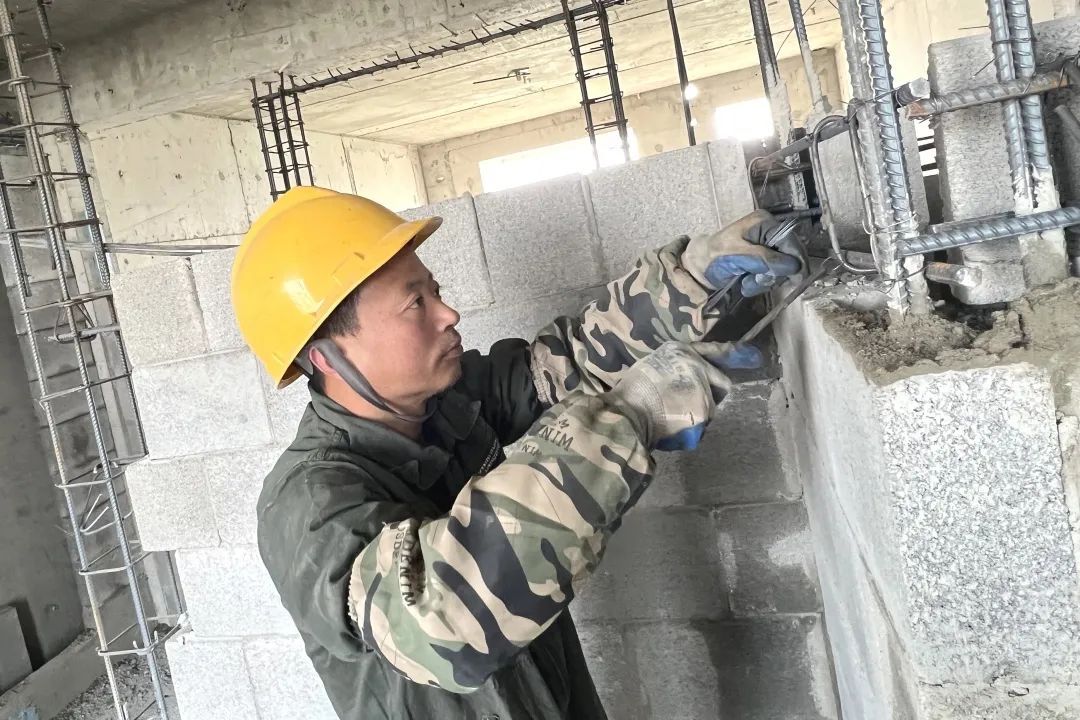 工人在进行二次结构的钢筋绑扎和墙体砌筑。