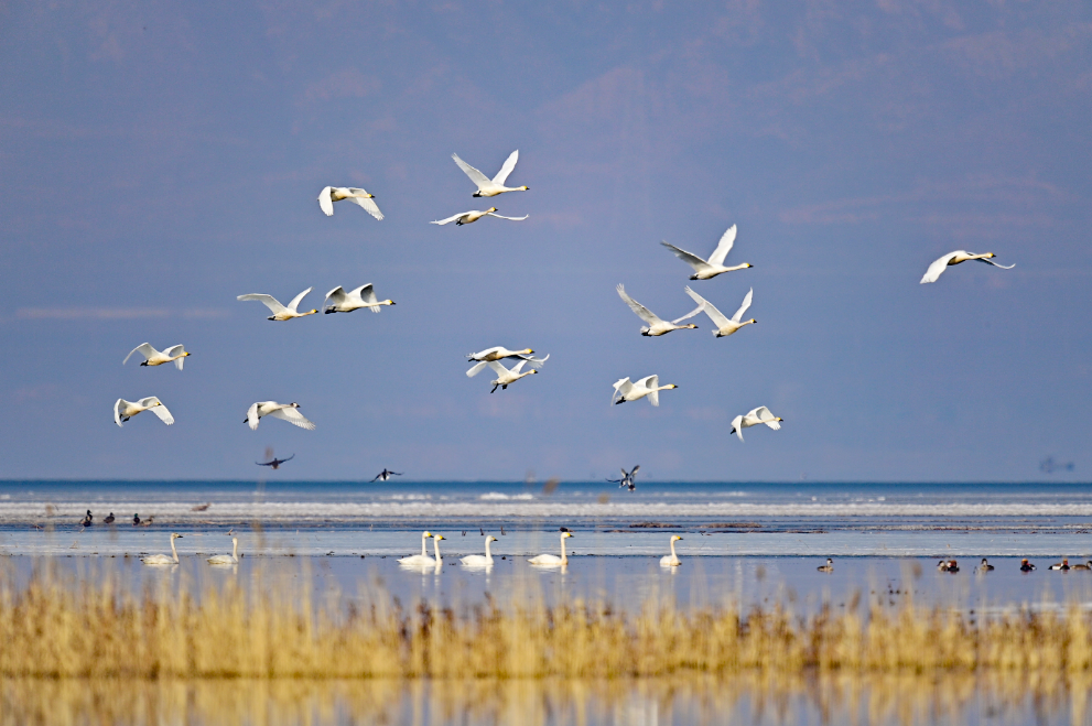 同时,野鸭湖还陆续监测到数十只晚迁徙的灰鹤、大天鹅,数万只赤膀鸭、绿头鸭、花脸鸭等各种野鸭,数千只豆雁、鸿雁,数百只红嘴鸥,数百只凤头麦鸡等候鸟共舞。
