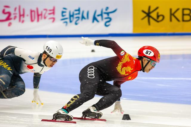 3月10日,中国选手林孝埈在比赛中。当日,在韩国首尔进行的2023年短道速滑世锦赛男子1000米预赛中,中国选手林孝埈以1分28秒174的成绩晋级四分之一决赛。新华社记者王益亮摄