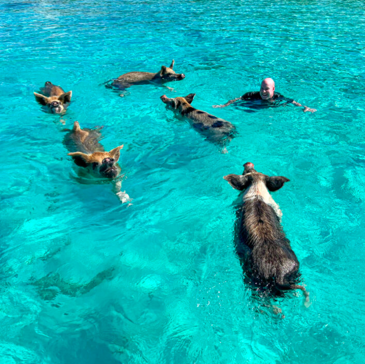 巴哈马“会游泳的猪”与游客嬉戏。