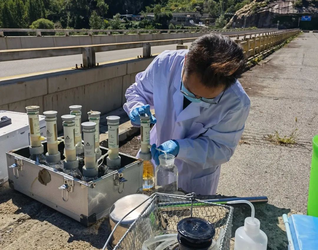 监测人员按照操作规范采集地表水样品↑
