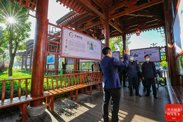 云南省陆良县纪委监委为主城区的幸福公园注入廉洁文化元素,开辟廉洁规范、革命路、好家风、身边榜样等多条路线和清风廊、清风亭、警钟长鸣等多个景观小品,让干部群众身临其境感受优良家风和廉洁文化魅力。图为该市党员干部和公职人员在公园参观游览。(云南省陆良县纪委监委 王勇 摄)