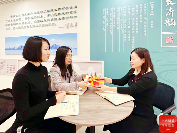 杭州市上城区城市建设发展集团对新提拔的年轻干部开展一对一廉政谈话,增强年轻干部廉洁意识和责任担当,弘扬崇尚廉洁抵制腐败的良好风尚。图为该集团纪委负责人在谈话后向年轻干部赠送廉政教育书刊。(杭州市上城区纪委监委王晰源 摄)
