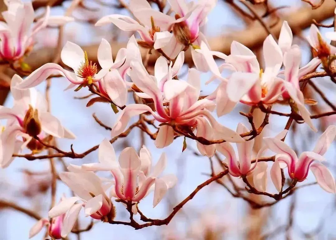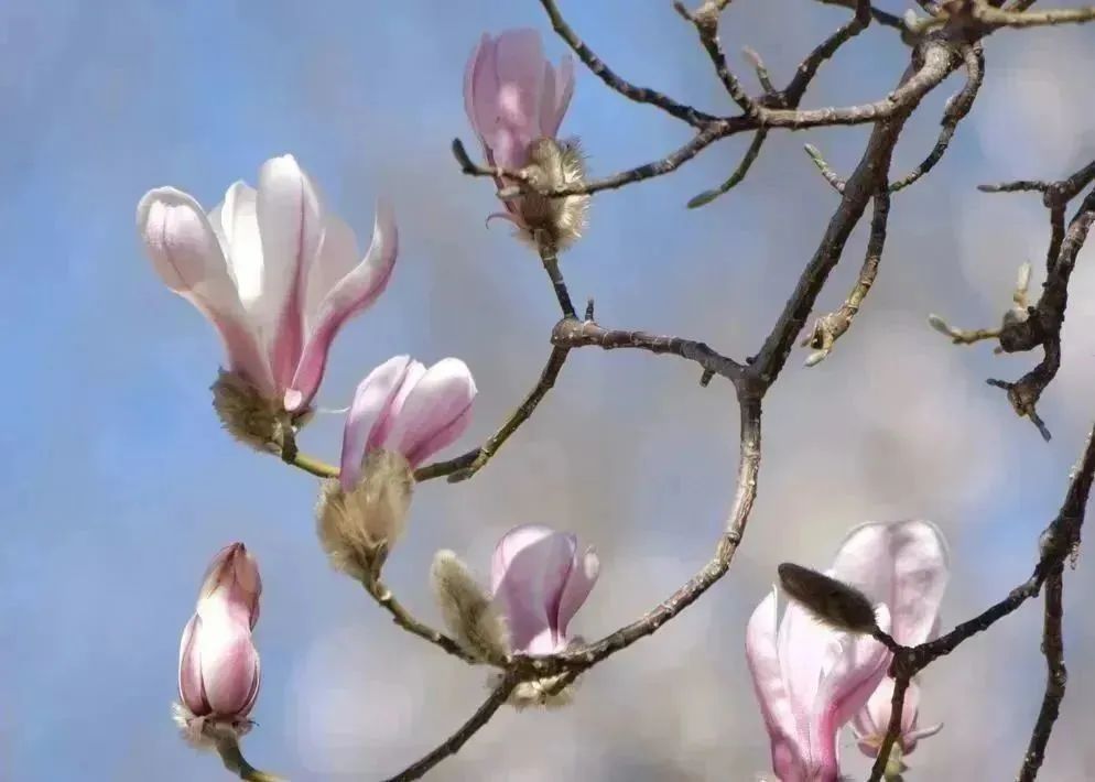 春风吹醒了花儿,树上开得早的要数玉兰花了,素雅、娴静的花朵,椭圆的花瓣,远看仿佛一个个小灯壶俏立枝头。玉兰花开时,满树花簇,粉得热烈、白得纯洁,远远望去,美极了。