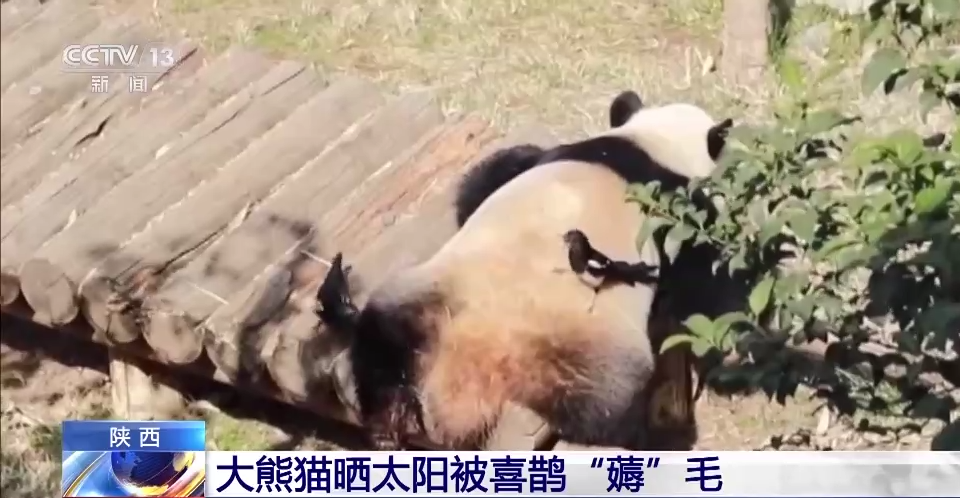 视频中,秦岭大熊猫研究中心11岁的雌性大熊猫正正趴在木床上惬意地晒着太阳,一只喜鹊在它身边来回打量,趁其不备,对准正正腿部就是一顿啄,衔走了不少大熊猫毛,正正懒洋洋地起身挪了个位置继续趴着,不予理会。