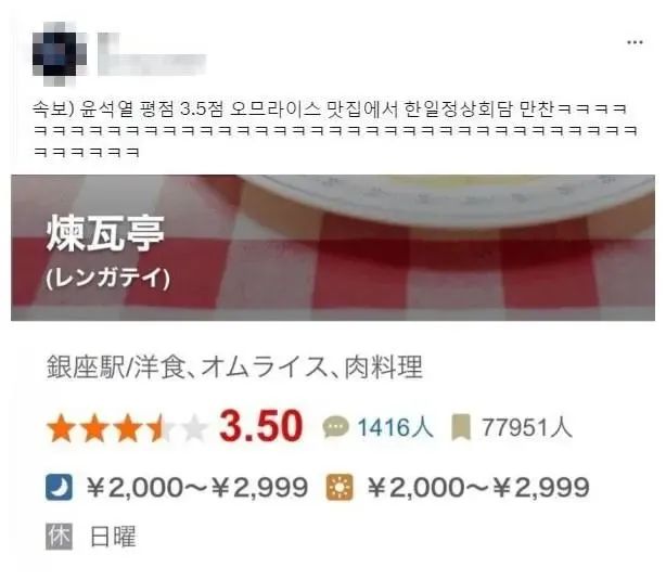 一些韩国网友则对日本为尹锡悦“量身安排”的西餐馆之行提出质疑。“首脑间的正式晚餐怎么会在如此简陋的餐厅举行?”“带他(尹锡悦)去评分3.5的蛋包饭店?”“太无语了。要不要和美国总统也在那种地方共进晚餐?”