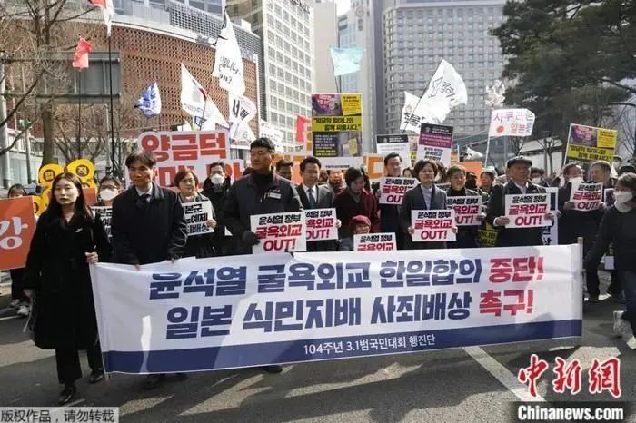 2023年3月1日,韩国民众在位于首尔的日本驻韩大使馆附近进行集会,举着写有“中断屈辱外交韩日协议”等口号的抗议横幅。