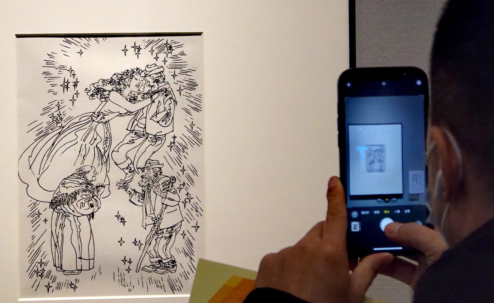 在二层展厅入口处,一面以历年《读者》杂志封面组成的展墙格外壮观。展厅内还有可供观众打卡拍照的《读者》封面合影框。此外,展厅里不少作品的展签上还放置了二维码,观众可以通过扫码观看视频,了解不同插图画家与《读者》的故事。