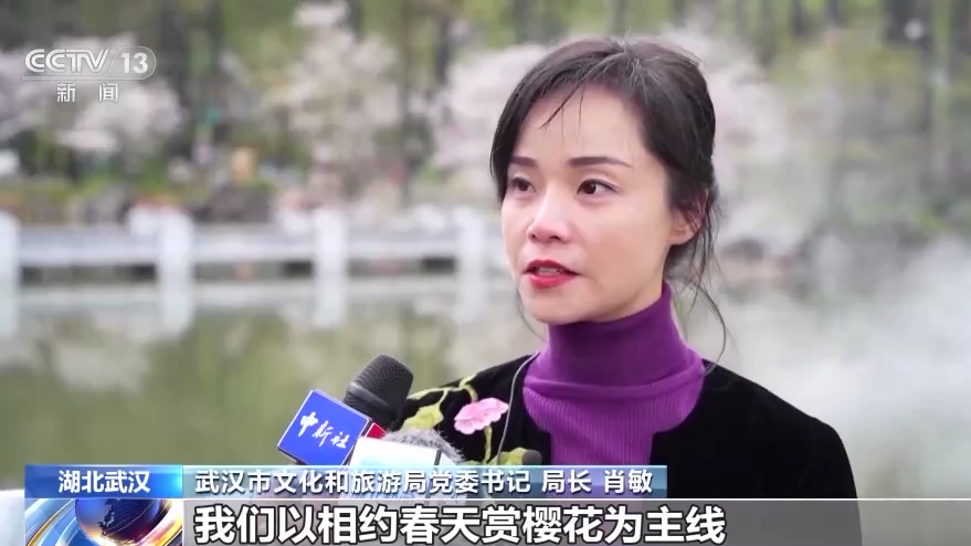 武汉市文化和旅游局党委书记、局长 肖敏:我们以相约春天赏樱花为主线,配合以鲜花市集、音乐节、长江夜游,还有光影表演、灯光秀等一系列的活动,营造全城赏花、全时赏花的氛围。