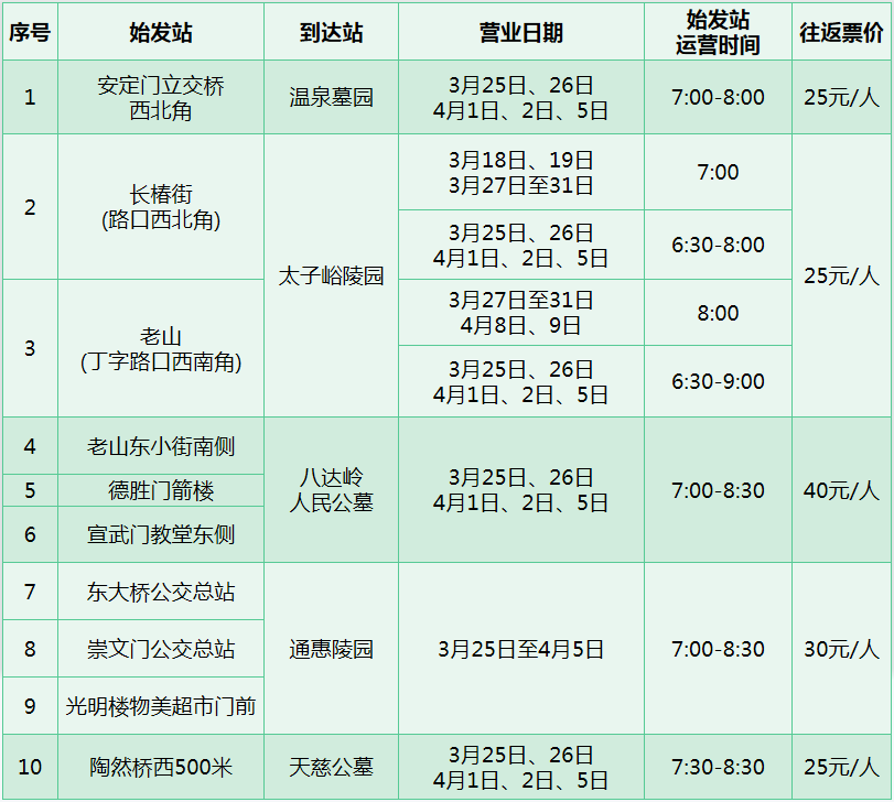 为方便广大市民到墓地陵园进行现场祭扫活动,公交集团开通10条由市区直达5处陵园墓地的清明扫墓专线。