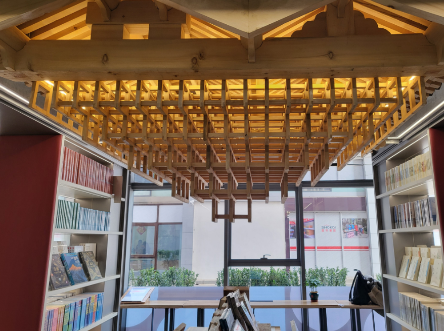 走进巨幅线装书造型的大门,上下两层的书院空间跃入眼帘,设计处处有巧思。“北京城市色彩的主旋律叫做丹韵银律,丹韵是红色系,银律是灰色系,所以我们整个空间的主题色就是红色和灰色。东南方向我们还装饰了一些蓝色,象征城市的水系。”现场工作人员李君博介绍,书院中的很多设计元素都来源于对北京城市文化的认识、解构与重组,既要向传统致敬,也有现代创意的衍生。“就拿大厅中的这盏灯具来说,远看可能觉得就是一个木结构的设计,走近后可以看到,它是把老北京传统的垂花门等比例缩小,再进行创意设计。”