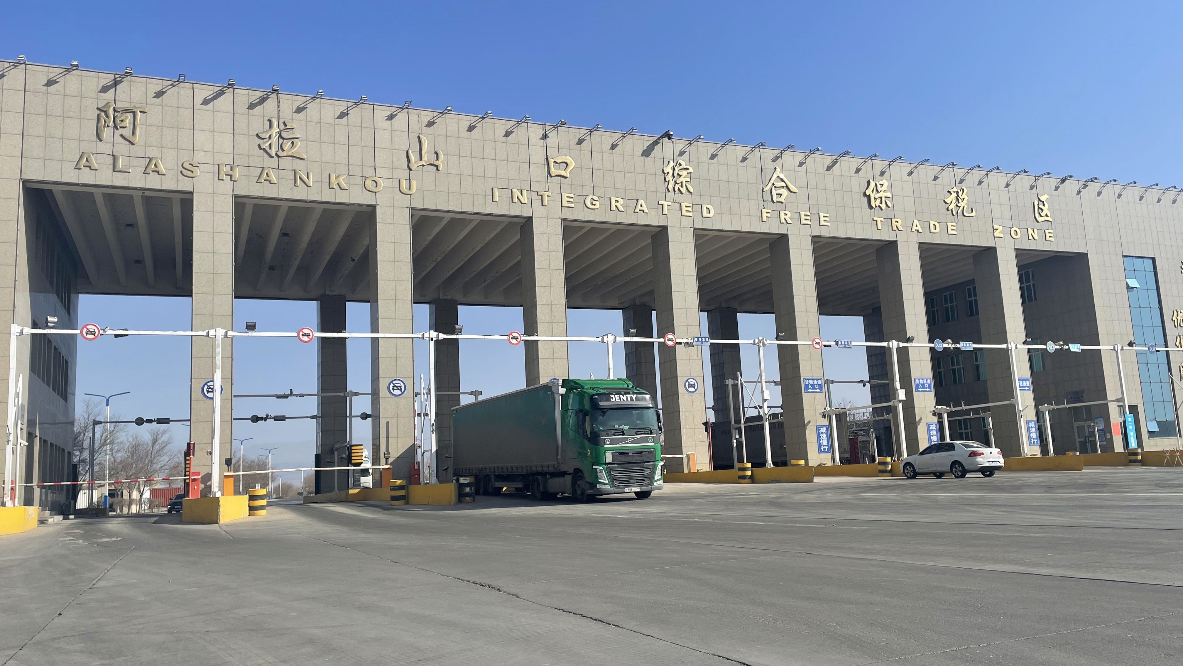 2023年3月21日,一辆国际运输车缓缓驶出阿拉山口综合保税区。新华社记者郝玉 摄