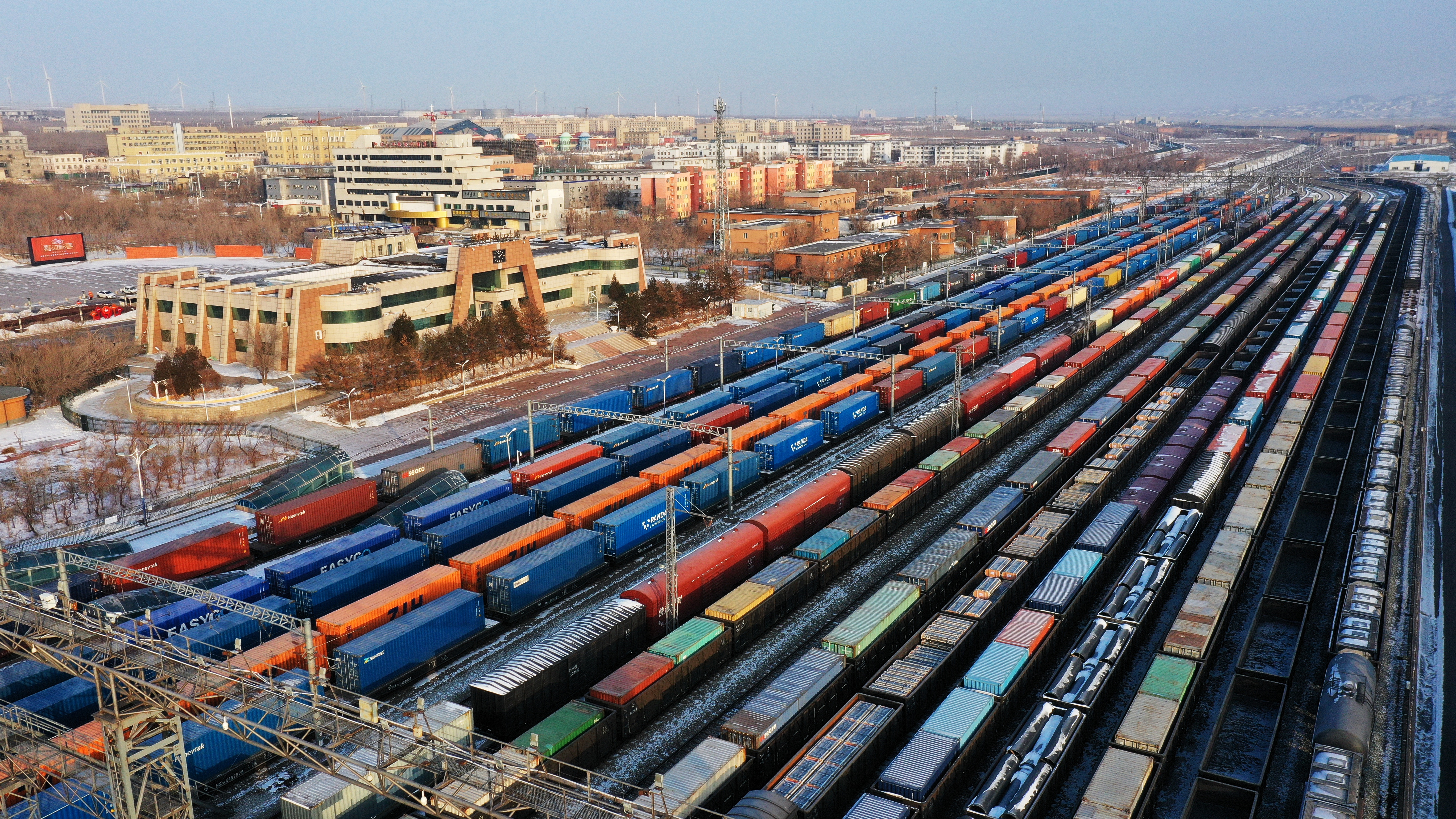 2023年1月25日,阿拉山口站编组场内出入境班列及其他货运列车正集结待出发。新华社发(程乾 摄)