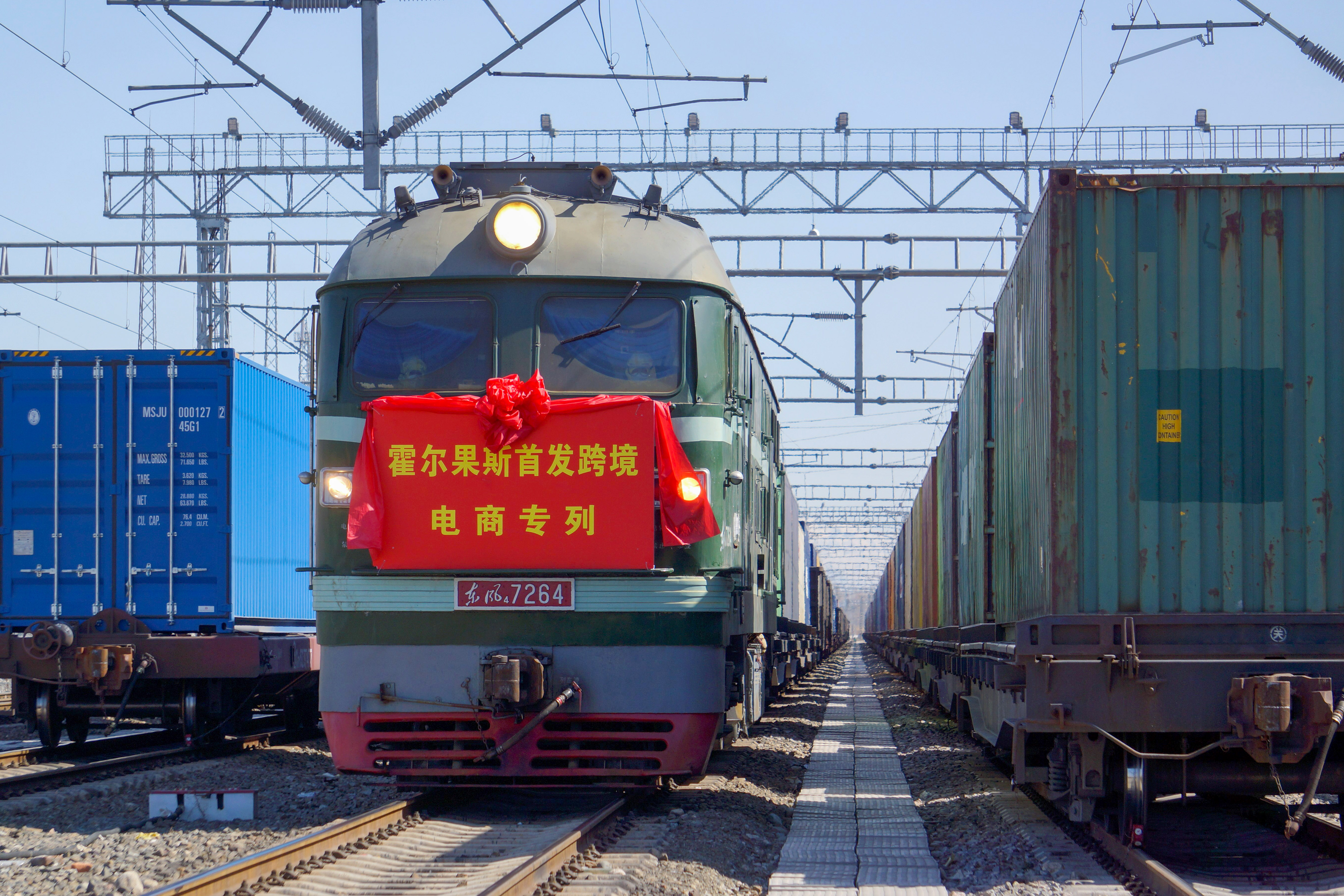 2022年4月1日,一列满载货物的跨境电商出口专列从霍尔果斯铁路口岸出境,驶往哈萨克斯坦。这是以霍尔果斯站为始发站开行的首列跨境电商专列。新华社发(邱静 摄)