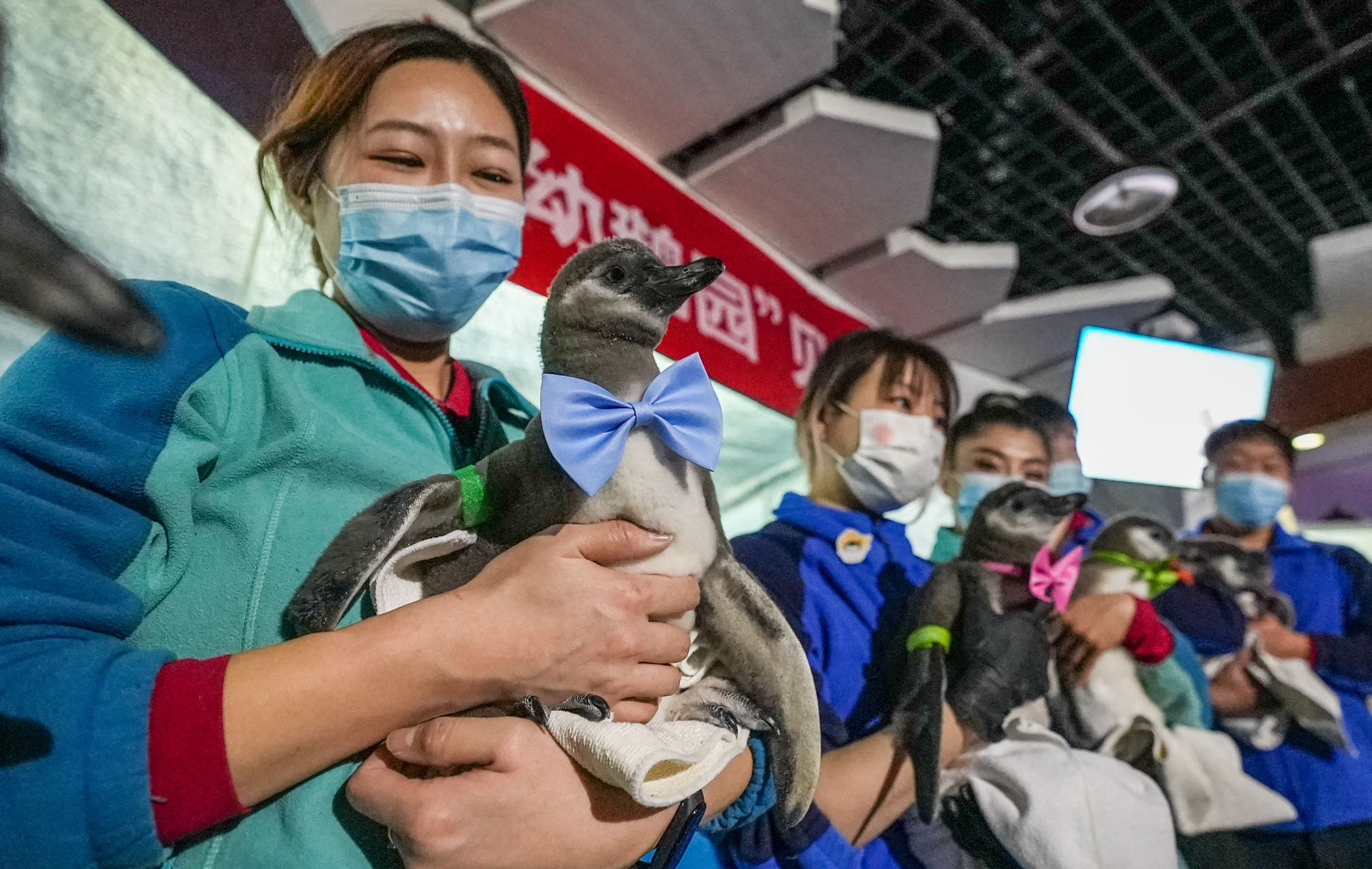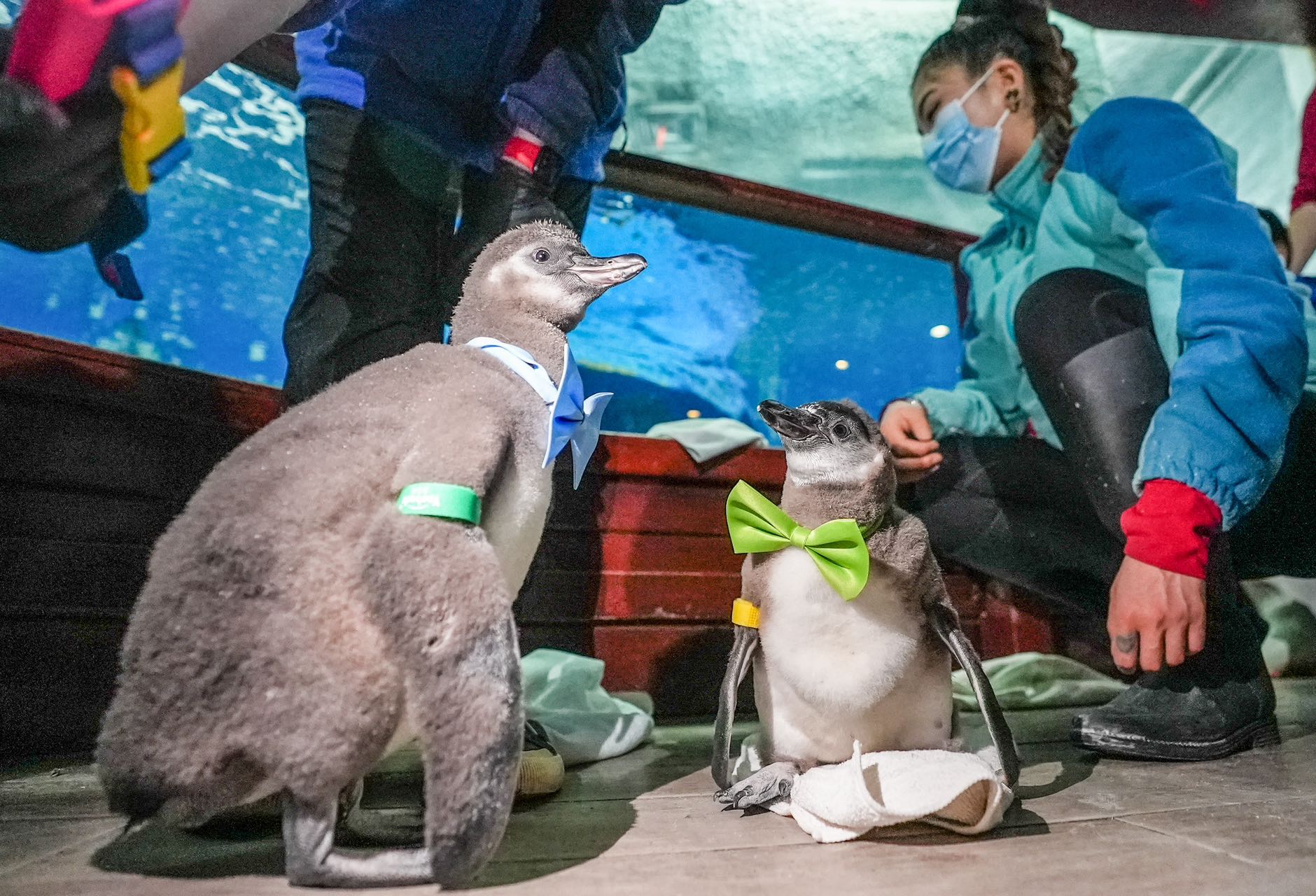3月26日,在北京太平洋海底世界博览馆,6只今年诞生的洪氏环企鹅宝宝首次与游客见面。今年初,6只自然孵化的洪氏环企鹅破壳诞生,历经90多天的育幼期,它们褪去稚嫩的羽翼,今天起由饲养员抱进企鹅馆,与它们的亲生企鹅爸妈和兄弟姐妹一起生活,博览馆专门为萌萌的小企鹅举办游客见面会。