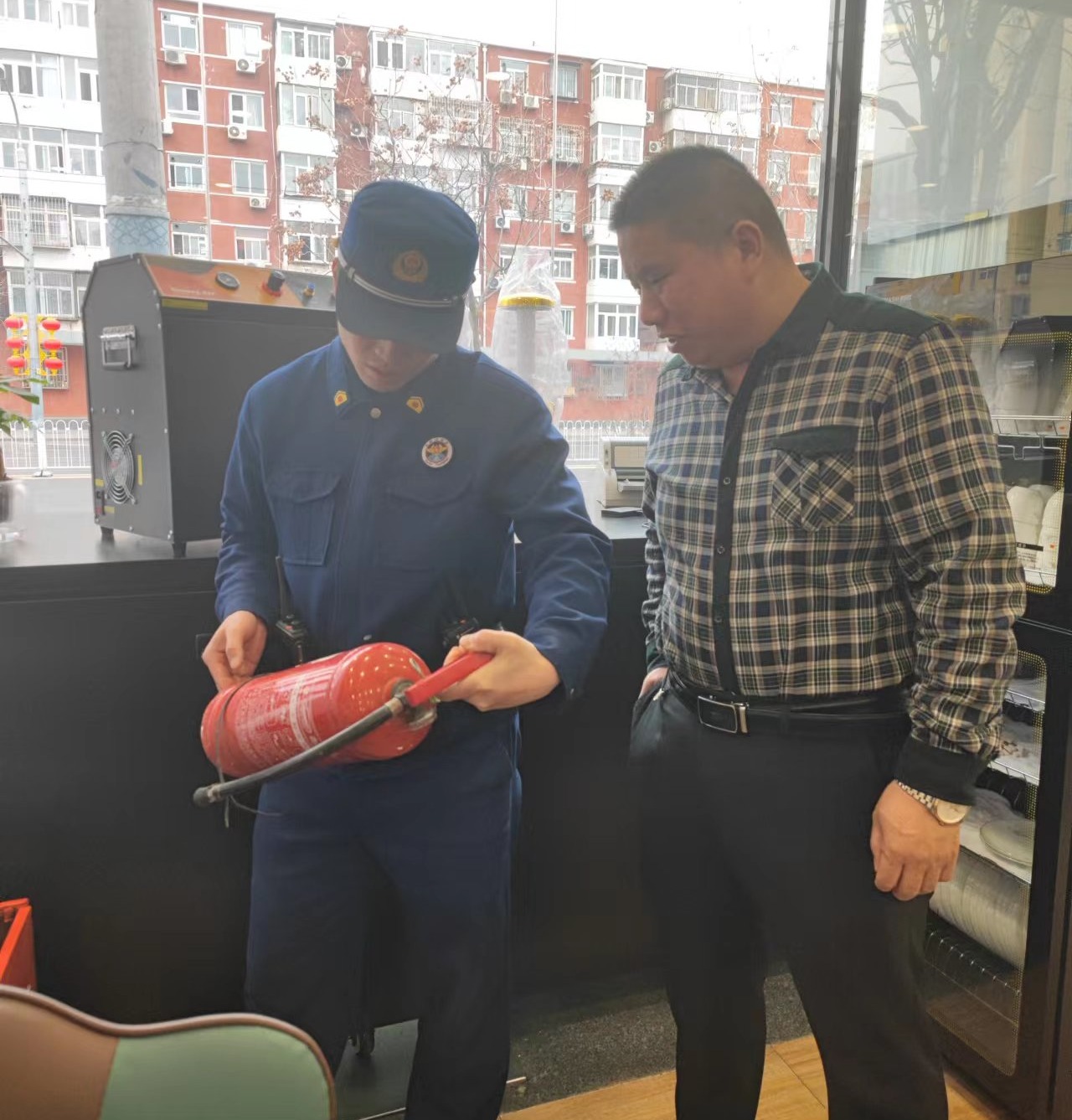 随后,徐峰又来到小区的底商,重点检查灭火器的配备和油烟道的清洁情况。“上次更换灭火器是什么时候?”针对重点餐饮商家,徐峰一进门就把灭火器作为检查重点,仔细地查看仪表指针情况。“如果灭火器出现压力不足,遇到火情是没法正常使用的,必须立即更换。”