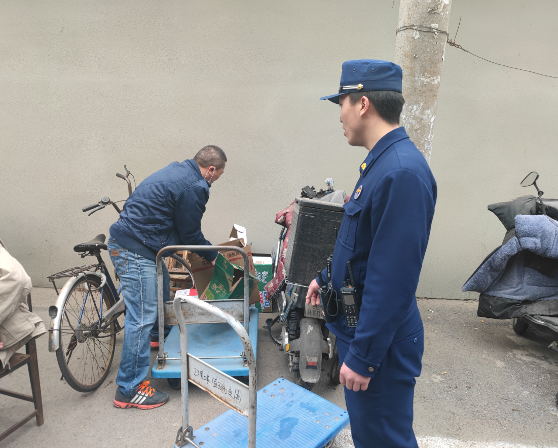 在社区一家便利店旁边堆放着一些纸箱。徐峰上前询问,店主承认确实是他将纸箱堆放到了公共区域里。“这些纸箱都是易燃品,现在天气干燥,有很大的消防隐患,请赶快处理。”