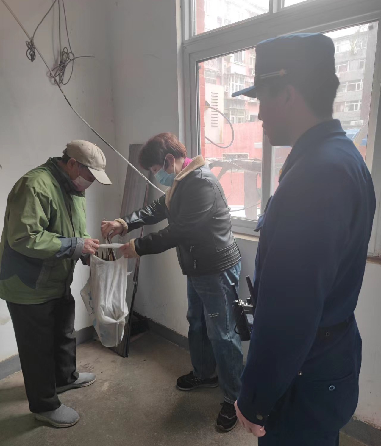 记者又跟随徐峰来到居民楼里巡查,有的居民将自家闲置的纸箱、桌椅等物品堆放在了楼道里。为此,徐峰逐一与就近的住户核实,并督促居民清理。