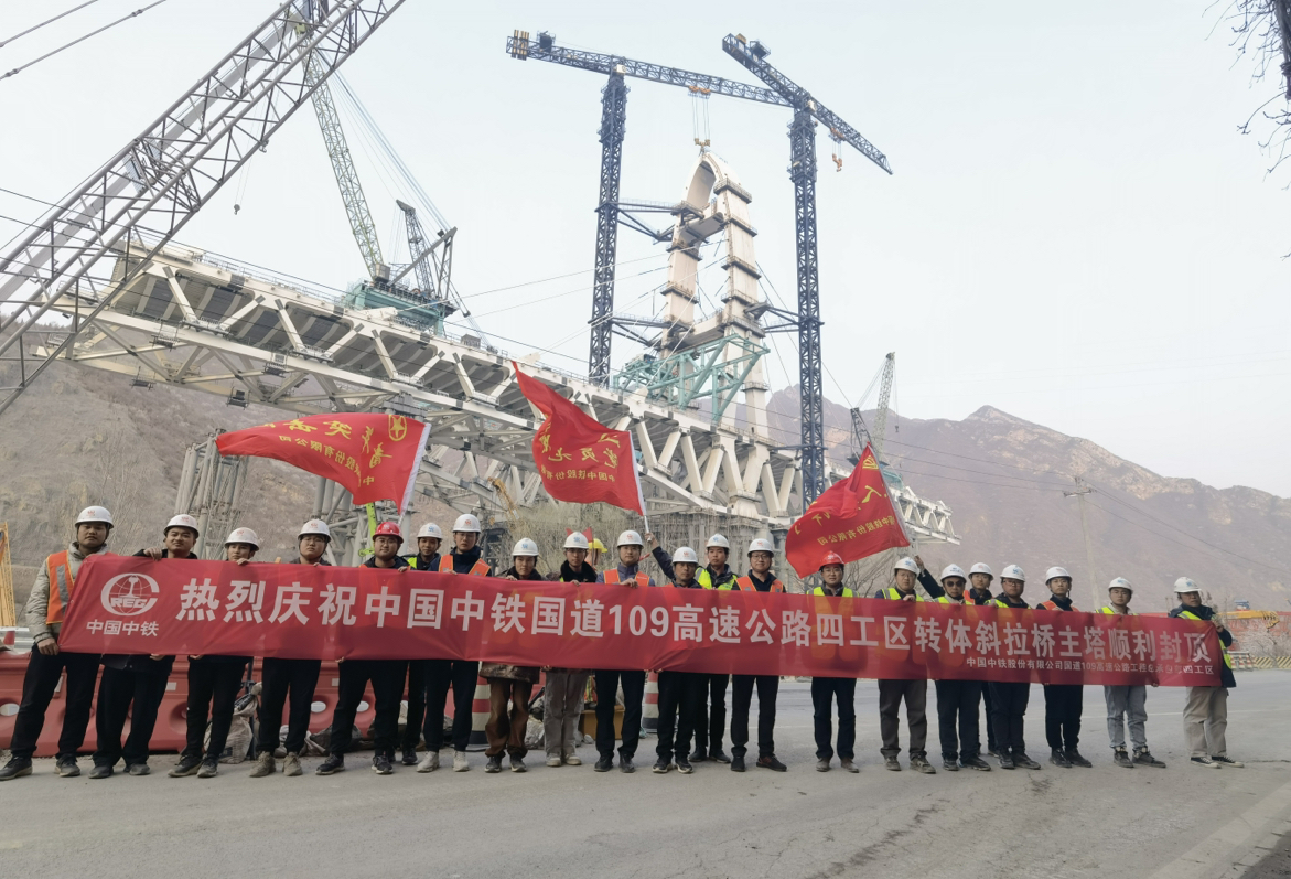 安家庄特大桥是国道109新线高速公路最具标志性的施工工程之一,由于该座大桥需横跨丰沙铁路、永定河和109国道,因此施工技术难度很大。目前,大桥的左幅钢塔已经顺利完成封顶,钢塔顶端距离地面高度为118米,工区严抓安全质量,稳步推进后续施工任务。