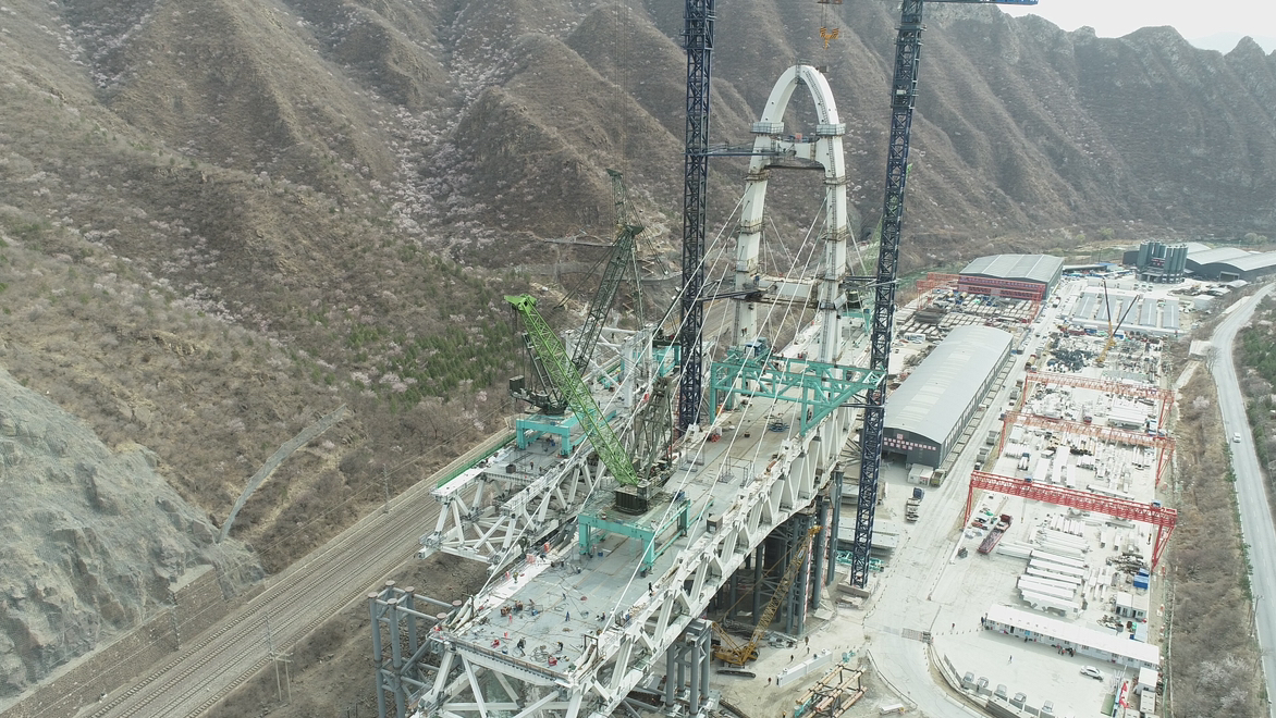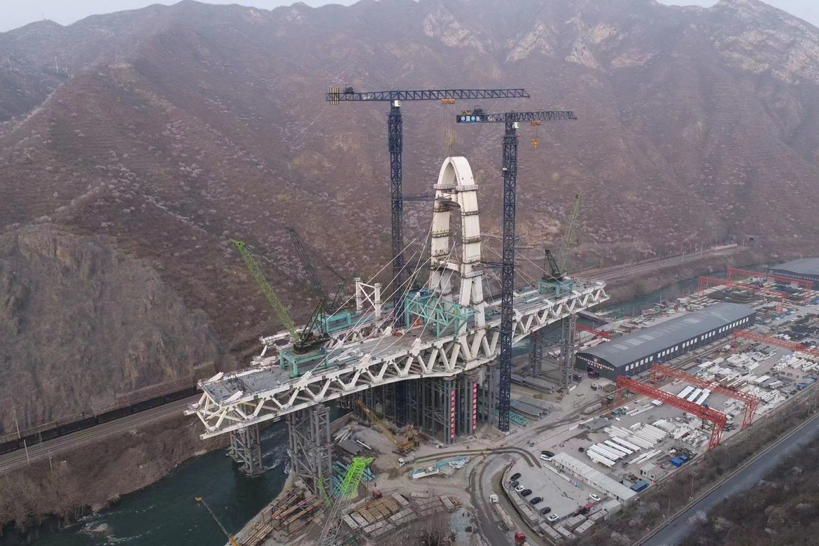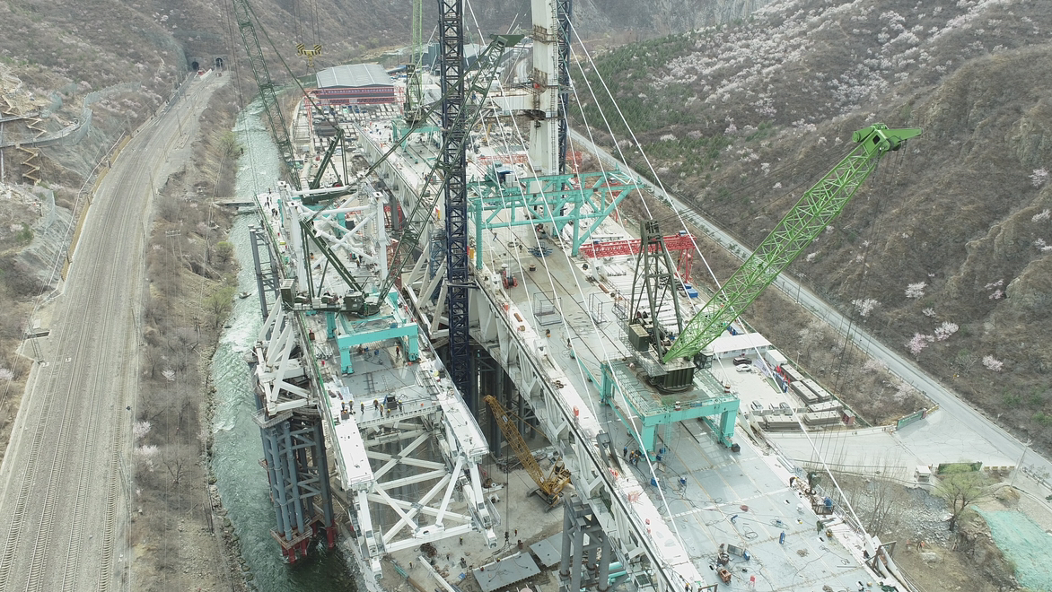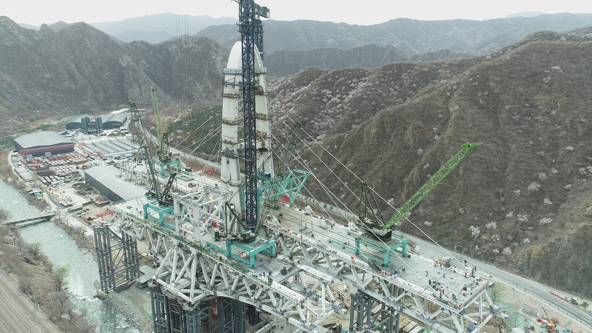据了解,安家庄特大桥位于门头沟区王平镇安家庄村西南,是国内首例墩顶双幅同步转体曲线钢桁梁斜拉桥梁。其中,大桥左幅桥面上的钢塔高达70米,正面呈“人”字形状,分为上下塔柱,采用钢箱结构,并设置18对斜拉索。